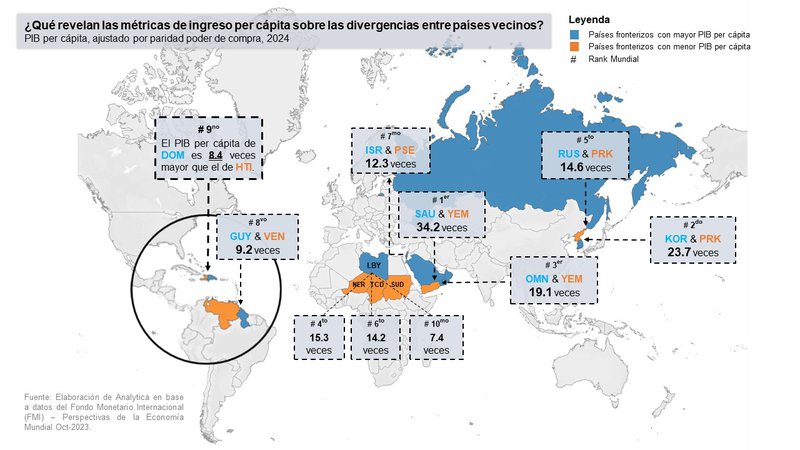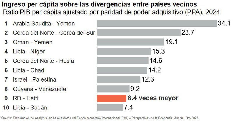 En marcado contraste, previo a la pandemia, el PIB per cápita de Haití permanecía estancado durante más de sesenta años, registrando niveles inferiores a los de países de África Subsahariana como Uganda, Chad y Etiopía, mientras que el de la República Dominicana se había multiplicado por diez en el mismo período. Esta divergencia es tan pronunciada que, a nivel mundial, solo países fronterizos como Arabia Saudita & Yemen y las dos Coreas, registran una disparidad mayor en el índice de desarrollo humano que la existente entre R.D. y Haití, con el agravante, por supuesto, de que nuestras fronteras son las únicas que comparten una isla.